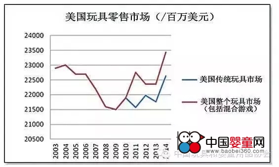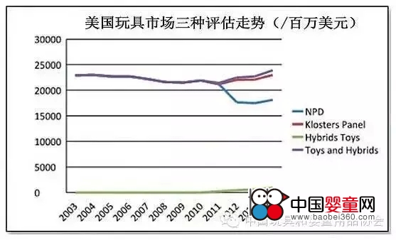 从2003年至2014年,美国玩具市场经历了近乎10年的停滞期。时至2012年,三种不同估算方式开始显现差异。NPD零售数据追踪显示,2012年玩具市场下降了20%;而另外两种调查的数据却显示美国玩具市场开始缓慢复苏。形成这样的差异的原因主要有二个:其一,NPD集团调查的数据仅仅为80%的美国玩具市场覆盖率;其二,NPD集团的调查数据没有涵盖混合游戏的经济效益。NPD定义的传统玩具市场数据完全忽略混合游戏的影响(如小龙斯派罗、迪士尼无限和任天堂等)。NPD定义混合游戏为电子游戏领域,尽管其85%的销售额是玩具人偶。如果将其销售额算入玩具收益数额,美国玩具市场便有了全新的景象。如下图所示: