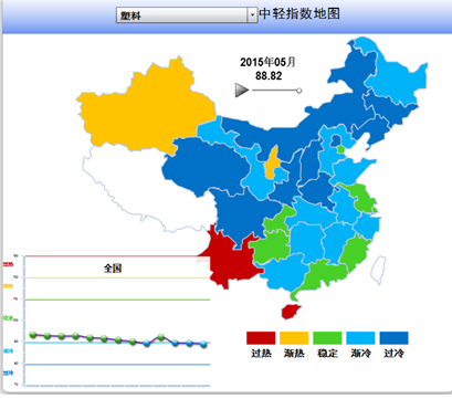 据“中国轻工业经济运行及预测预警系统”数据监测显示:2015年5月份地区塑料景气指数为红色(过热)地区为2个,与4月持平,黄色(渐热)地区比4月增加2个。绿色(稳定)地区为6个,比上月减少1个省份,沿海主产区塑料景气指数均除江苏、福建和广东省外,地区景气度均滑落至蓝色渐冷区间,带动全国指数走低。