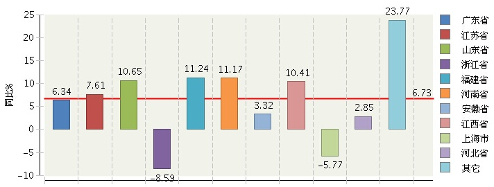 3、福建、河南、山东、江西四省呈现两位数增长
