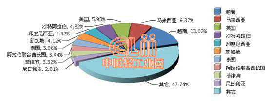 从出口增速看,对越南、泰国、新加坡、美国出口额大幅增长,其中出口越南同比增长292.87%,出口占比由上年同期第五跃升为首位。对印度尼西亚、马来西亚、尼日利亚出口额同比负增长,降幅为个位数,详见图2。