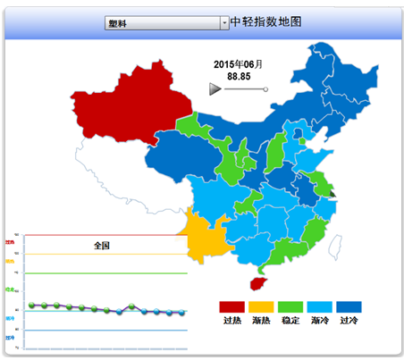 2015年6月塑料制品行业景气指数地图(左下小图为塑料景气指数月度走势)
