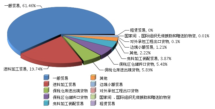 根据海关总署公布数据, 2015年1~6月,全国电池行业累计完成出口额同比增长16.91%。其中: 一般贸易完成累计出口额占61.46%,同比增长22.05%;进料加工贸易完成累计出口额占19.74%,同比增长-0.53%;保税仓库进出境货物完成累计出口额占5.89%,同比增长72.69%;保税区仓储转口货物完成累计出口额占5.48%,同比增长-15.86%;来料加工装配贸易完成累计出口额占3.87%,同比增长4.85%2015年1~6月全国电池行业累计出口额贸易方式占比情况如下图所示。