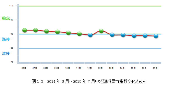 2015年7月份中轻塑料景气指数为88.59,比上月回落0.26点。塑料景气指数目前仍在蓝色渐冷区间运行。