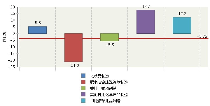 从各子行业完成利润情况看,子行业利润格局发生改变,由于肥皂及合成洗涤剂行业持续出现负增长及化妆品行业高速增长,自今年2月起,化妆品制造行业累计完成利润总额已经超过肥皂及合成洗涤剂制造行业,居各子行业第一。
