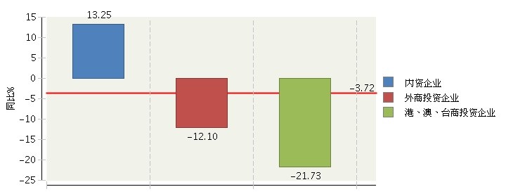 各注册类型企业本季度完成利润具体数据为:内资企业完成累计利润总额占48.25%,同比增长13.25%;外商投资企业完成累计利润总额占34.74%,同比增长-12.1%;港、澳、台商投资企业完成累计利润总额占17.01%,同比增长-21.73%。