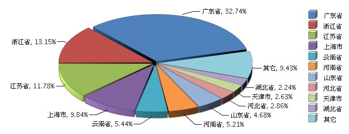2015年上半年全国日化行业规模以上企业累计完成利润总额比重主要集中在广东省、浙江省、江苏省、上海市、云南省、河南省、山东省、河北省、天津市、湖北省等地区。其中:广东省完成累计利润总额占32.74%;浙江省完成累计利润总额占13.15%;江苏省完成累计利润总额占11.78%;上海市完成累计利润总额占9.84%;云南省完成累计利润总额占5.44%。