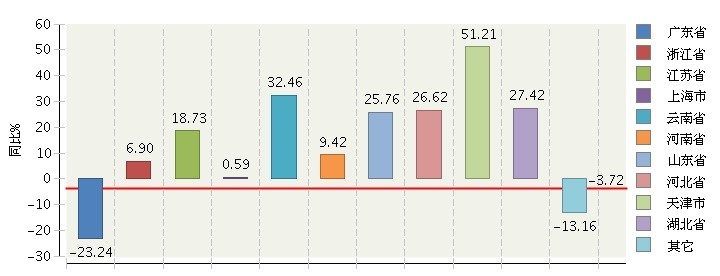 图 2015年上半年全国日化行业累计利润总额主要地区同比增长情况
