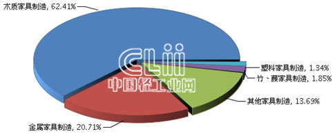 根据国家统计局数据显示,2015年1~2月,家具行业规模以上企业累计完成主营业务收入(下同)中,木质家具制造业占比达到62.41%,金属家具制造业占20.71%,其他家具制造业占13.69%,竹、藤家具制造业占1.85%,塑料家具制造业占1.34%(图2)。
