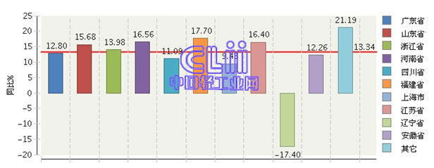 上述十个地区中,除了辽宁的累计主营业务收入增速(下称“累计增速”)为两位数负增长,上海为一位数正增长以外,其他8个地区的累计增速均超过了10%,其中福建、河南、江苏、山东及浙江5个地区的累计增速超过了全国家具行业平均水平(图5)。