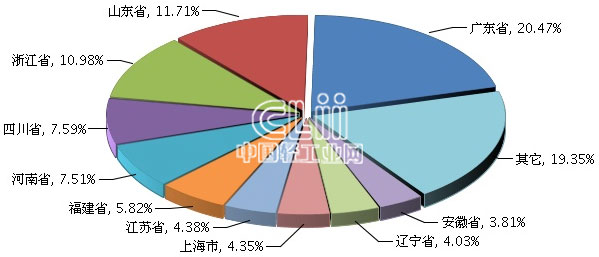 一季度,家具行业累计主营业务收入居全国前10位的地区依次是广东、山东、浙江、四川、河南、福建、江苏、上海、辽宁及安徽,累计主营业务收入合计占比达到了80.65%。前三甲地位不变,其中,广东的累计主营业务收入(下同)占20.47%,山东占11.71%,浙江占10.98%(图6)。与1~2月相比,四川超过河南成为第四,江苏越过上海成为第七,其他6个地区的排名依旧。