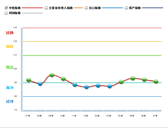 2015年7月份中轻饮料景气指数为90.84。饮料景气指数进入绿色稳定区间,呈平稳运行走势。具体的分项指数为:收入景气指数87.01、利润景气指数104.35。(见图1)