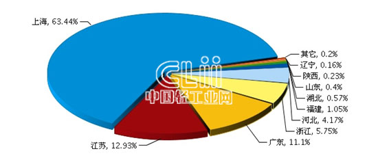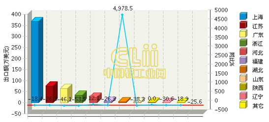从出口地区来看,比重主要集中在上海、江苏、广东、浙江、河北等地区。其中:上海完成累计出口额367.8万美元(占63.44%),同比增长-18.35%。