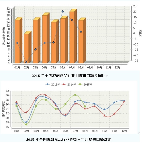 2015年1-8月全国农副食品行业进口额月度走势