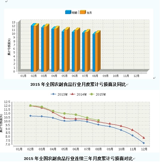 2015年1月~8月,全国农副食品行业累计亏损面为10.12%,同比增长0.29%。其中:1月~2月份累计亏损面为12.03%,同比增长-0.04%;1月~3月份累计亏损面为11.88%,同比增长0.27%;1月~4月份累计亏损面为11.33%,同比增长0.13%;1月~5月份累计亏损面为11.01%,同比增长0.5%;1月~6月份累计亏损面为10.85%,同比增长0.47%;1月~7月份累计亏损面为10.46%,同比增长0.23%;1月~8月份累计亏损面为10.12%,同比增长0.29%。