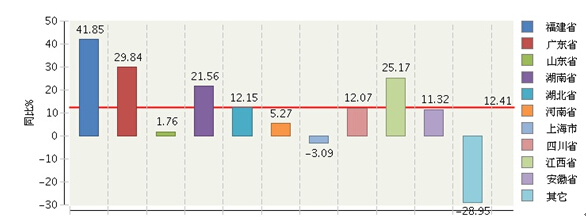 图 2015年1月~8月全国糖果累计产量主要地区同比增长情况