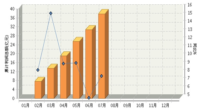 图1 2014.6—2015.7自行车行业利润景气指数变化态势 2015年1月~7月,全国自行车制造行业累计完成利润总额37.80亿元,同比增长7.77%,增速比6月份有所回升,上升2.69个百分点。(参见图2)。 图2 自行车行业月度累计利润总额走势图 从子行业分布情况看,电动自行车行业累计利润总额超过22亿元,同比下降0.47%;脚踏自行车行业累计利润总额超过15亿元,同比增长22.99%。