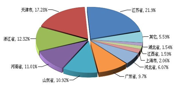 图1 2014.8—2015.8自行车行业主营业务收入景气指数变化态势 二、主营业务收入完成情况 2015年1月~8月,全国自行车制造行业累计完成主营业务收入927.09亿元,同比增长3.47%。今年以来,行业主营业务收入增速明显低于去年同期水平,除2月份外,一直处于3%-5%之间。(参见图2) 图2 2015年全国自行车行业累计主营业务收入及同比 2015年1-8月份全国自行车行业下辖的两个子行业完成主营业务收入的状况是:脚踏自行车及残疾人座车制造行业累计完成主营业务收入409.94亿元,同比增长4.83%;助动自行车制造行业累计完成主营业务收入517.15亿元,同比增长2.42%。 二、主营业务收入分地区完成情况 2015年1月~8月,全国自行车制造行业完成累计主营业务收入927.09亿元,同比增长3.47%。主要集中在江苏省、天津市、浙江省、河南省、山东省等地区,这5省市的比重占全国的73.43%(参见图3)。从增长情况来看,河南省增速最高,达到28.78%。 图3 2015年1~8月全国自行车行业累计主营业务收入地区占比情况