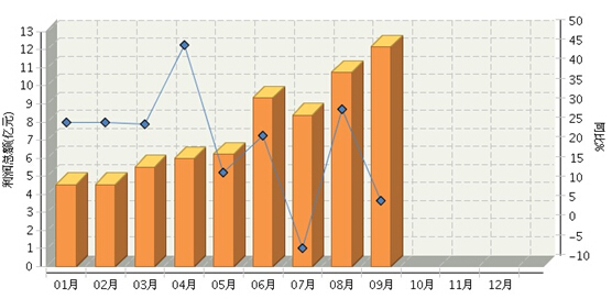 2015年三季度累计完成利润总额31.28亿元,其中,7月份完成利润总额8.38亿元,同比增长-5.43%;8月份完成利润总额10.73亿元,同比增长30.21%;9月份完成利润总额12.17亿元,同比增长6.81%。(参见图2)