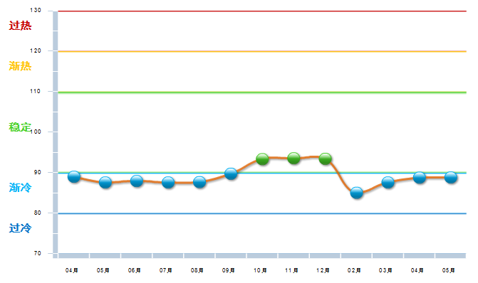 工艺美术利润景气指数一年来尽管在稳定区域运行,但处于下降趋势,至5月已接近稳定与渐冷的临界点。