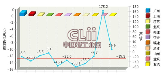 从进口地区来看,比重主要集中在广东、上海、江苏、北京、天津等地区。其中:广东完成累计进口额0.93亿美元(占45.31%),同比增长-8.94%;上海完成累计进口额0.54亿美元(占26.22%),同比增长-26.72%。