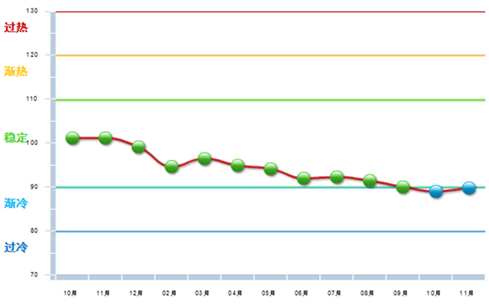 图1 2015.11自行车行业景气指数分指标显示状况 2015年以来,自行车行业受国内外经济环境影响,景气指数逐月走低,全年呈下滑走势,在7月份略有回升后,10月份步入渐冷区间(参见图2)。 图2 2014.10—2015.11自行车行业景气指数变化态势
