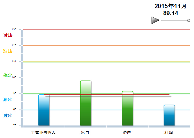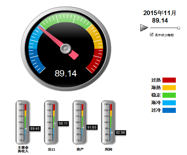 2014年10月至2015年2月,中轻皮革景气指数基本稳定,在90~100间小幅波动,处于稳定提示区的下半区。3月中轻皮革景气指数89首次跌入渐冷提示区,11月仍然在渐冷提示区运行(参见图3)。