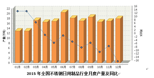 2015年我国不锈钢日用制品产量全年呈平稳走势,但增速震荡下行