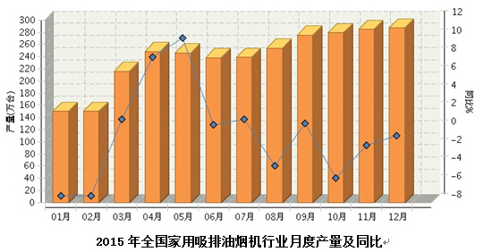 国家统计局数据显示,2015年1月~12月,全国家用吸排油烟机累计完成产量同比增长-0.53%,继续为负增长,较去年同期下降了3.05个百分点。2015年各月完成产量总体呈平稳上升走势。