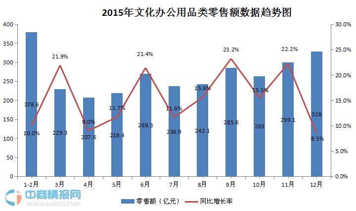 2015年全年,限额以上单位消费品零售额142558亿元,同比增长7.8%。其中文化办公用品类1-12月份零售额2963亿元,同比增加15.2%。