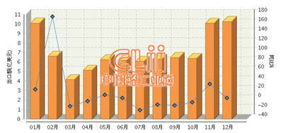 从月度出口额情况看,年初、年末的1、11、12月出口额大幅高于其他月份。其中1月份出口金额10.11亿美元,仅低于12月;2月份出口6.61亿美元,同比增长175.74%,为全年单月最高增速;3月同比下降,当月出口4.14亿美元,为全年单月最低;4~10月出口没有明显改善,大多同比下降,单月出口额维持在6亿元左右,其中7月份出口额同比下降20.87%,为全年单月最高降幅;11、12月出口大幅增长,其中11月同比增长34.13%,仅低于2月份,12月出口10.26亿美元,为全年单月最高值,详见图2。