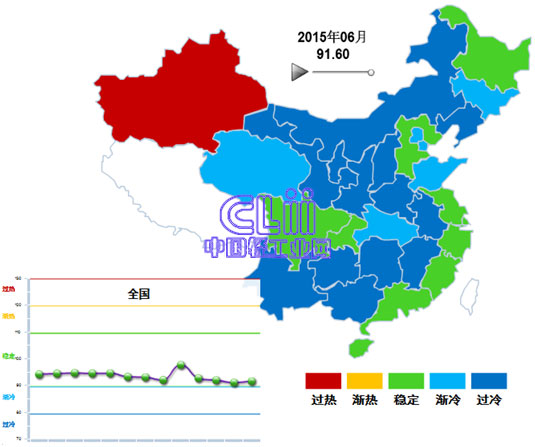 6月,仅有新疆属于“过热”区间,占全国地区总数(下同)的3.23%;因5月原处于“过热”区间的四川以及原属于“渐冷”区间的黑龙江都进入了“稳定”区间,但同时青海由“稳定”区间进入了“稳定”区间,造成“稳定”区间的地区变为10个,占全国的32.26%;处于“渐冷”区间的地区增至6个,占全国的19.35%,与5月相比,山东和湖北2个地区未发生变化;由于吉林、北京及天津3个地区转变为“渐冷”后,使得属于“过冷”区间的地区减至13个,占全国的41.94%(图3)。