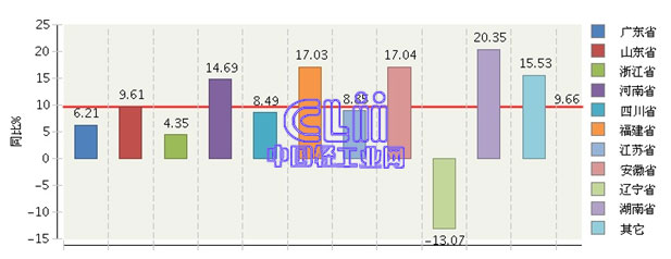 图7 2015年1~10月主要地区家具行业规模以上企业累计主营业务收入增速情况