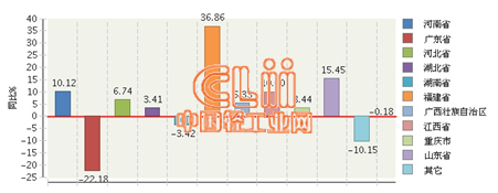 图2 2015年1月~12月全国卫生陶瓷制品行业累计产量主要地区同比增长情况
