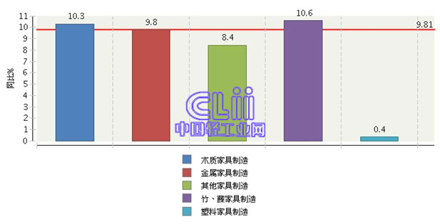 图5 2015年1~11月家具子行业规模以上企业累计主营业务收入增速情况