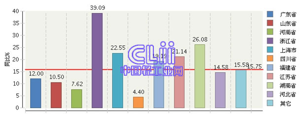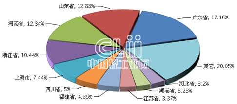 1~11月,家具行业累计利润额居全国前九位地区的排名与1~10月相同,第十位由河北变为了江西。其中,广东累计利润总额(下同)占17.16%,山东占12.88%,河南占12.34%,浙江占10.44%,上海占7.44%,四川占5.00%,福建占4.89%,江苏占3.37%,湖南占3.23%,江西占3.20%(图6)。