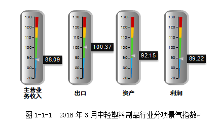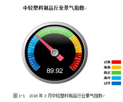 中国轻工业经济运行及预测预警系统监测显示:2016年3月份中轻塑料景气指数为89.92,比上月回升1.99点。目前,塑料景气指数虽运行在蓝色渐冷区间,但已接近渐冷区间上轨。