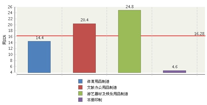 2016年1月~4月,全国文教体育行业完成累计主营业务收入同比增长9.52%(全国轻工全行业完成累计主营业务收入同比增长5.71%)。其中,体育用品制造完成累计主营业务收入占43.53%,同比增长9.16%;文教办公用品制造完成累计主营业务收入占29.33%,同比增长11%;游艺器材及娱乐用品制造完成累计主营业务收入占15.35%,同比增长14.23%;本册印制完成累计主营业务收入占11.79%,同比增长1.87%。