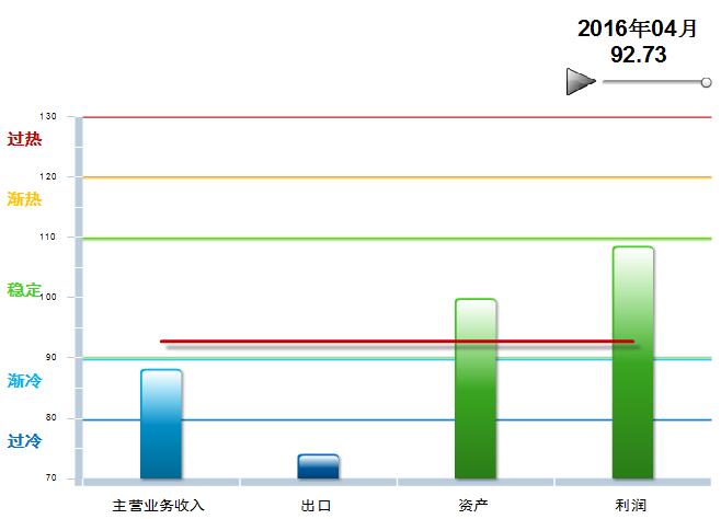2016年4月电池收入指数为88.18,电池出口景气指数为74.07,电池资产景气指数为99.91,电池利润景气指数为108.57。