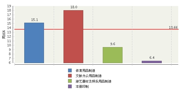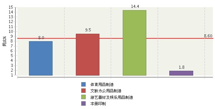 2016年1月~5月,全国文教体育行业累计完成主营业务收入同比增长8.60%,高于全国轻工业累计主营业务收入增速2.36个百分点。其中, 5月份完成主营业务收入同比增长5.39%。分4个子行业看,体育用品制造完成累计主营业务收入占42.85%,同比增长7.95%;文教办公用品制造完成累计主营业务收入占29.91%,同比增长9.51%;游艺器材及娱乐用品制造完成累计主营业务收入占15.59%,同比增长14.36%;本册印制完成累计主营业务收入占11.66%,同比增长1.85%。