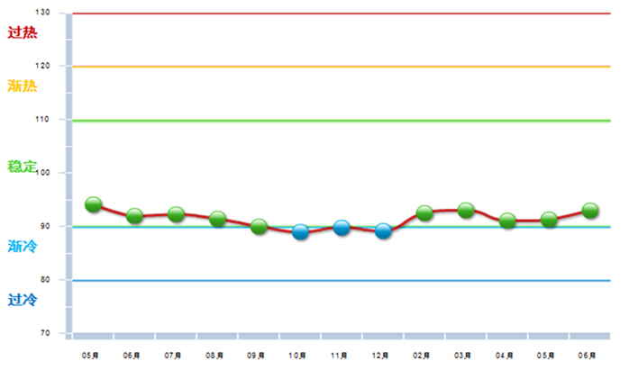图1 2016.6自行车行业景气指数分指标显示状况 行车行业运行指数在2015年一路走低,步入渐冷区间,自进入2016年以来,进入到稳定区间,但一直在稳定区间的地位徘徊(参见图2)。 图2 2015.5—2016.6自行车行业景气指数变化态势
