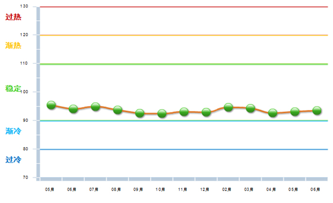 图1 2015.5—2016.6自行车行业主营业务收入景气指数变化态势