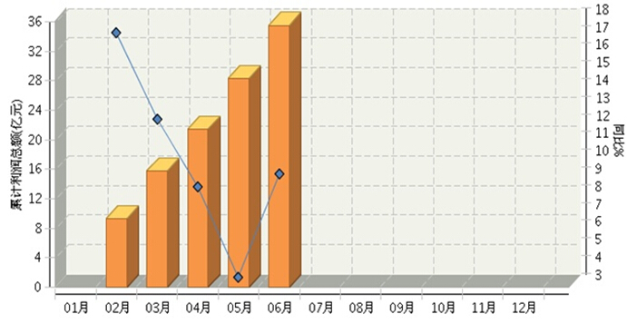 图1 2015.5—2016.6自行车行业利润景气指数变化态势 2016年1月~6月,全国自行车制造行业累计完成利润总额35.50亿元,同比增长9.40%,增速比上月大幅提高。(参见图2)。 图2 自行车行业月度累计利润总额走势图 从子行业分布情况看,电动自行车行业累计利润总额超过23亿元,同比增长20.34%;脚踏自行车行业累计利润总额超过12亿元,同比下降6.39%。