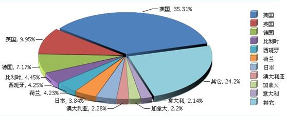 出口的主要对象国是美国、英国、德国等国家和地区。其中:其中:对美国出口额占总出口额的35.31%,对英国出口额占9.95%,对德国出口额占7.17%。