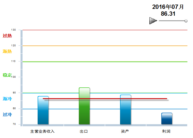 2015年6月至2016年7月,中轻皮革景气指数基本稳定,在90附近小幅波动,处于稳定提示区的下半区运行,至7月已经在渐冷提示区运行17个月,且呈下行趋势(参见图3)。