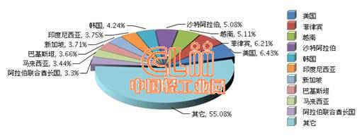 图1 2016年1~9月全国陶瓷砖累计出口额贸易国占比情况