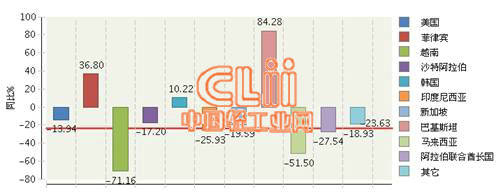 图2 2016年1~9月我国陶瓷砖累计出口额主要贸易国同比增长情况