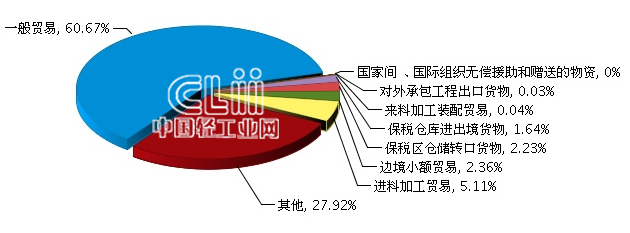 2016年1月~9月全国白炽灯泡行业累计出口额贸易方式占比情况