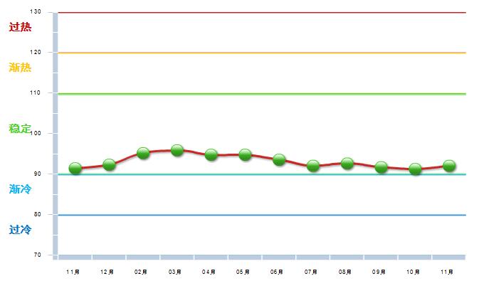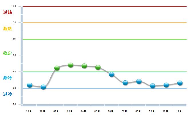 从分指标运行指数来看,11月份主营、出口、资产、利润四项分项景气指数均高于去年同期水平。从前11月月度走势看,主营、资产景气指数保持平稳;出口景气指数在稳定区间内不断上下波动;利润景气指数上半年4个月份回升至稳定区间,6月份开始下滑至渐冷区间,三季度波动下行,四季度翘尾回升。11月当月,主营业务收入指数92.27,较上月上升0.36点;出口景气指数99.12,环比上升2.83点。资产景气指数96.68,环比上升0.22点。利润景气指数83.08,较上月回升1.21点。