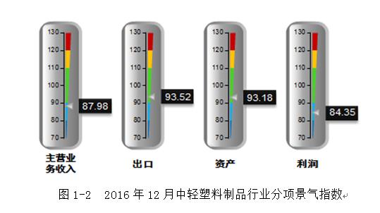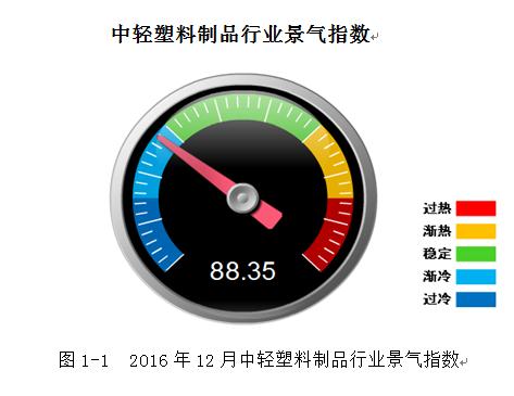 中国轻工业经济运行及预测预警系统监测显示:2016年12月份中轻塑料景气指数为88.35,比上月回落0.41点。目前,塑料景气指数虽运行在蓝色渐冷区间,但已接近绿色稳定区间底部,全年指数走势比较平稳。