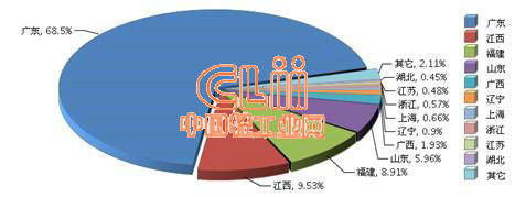 2016年广东陶瓷砖出口额继续领先其他省份。据海关数据显示,2016年1~12月广东陶瓷砖累计出口37.88亿美元(同比下降38.47%),占我国陶瓷砖出口总额的68.5%;与上年同期相比,占比下降了5.45个百分点,详见图1。